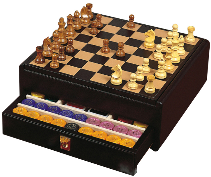 Шахматы Renzo Romagnoli в черном боксе, доска - дерево+кожа, фигуры - дерево, 430 х 410 х 165 мм