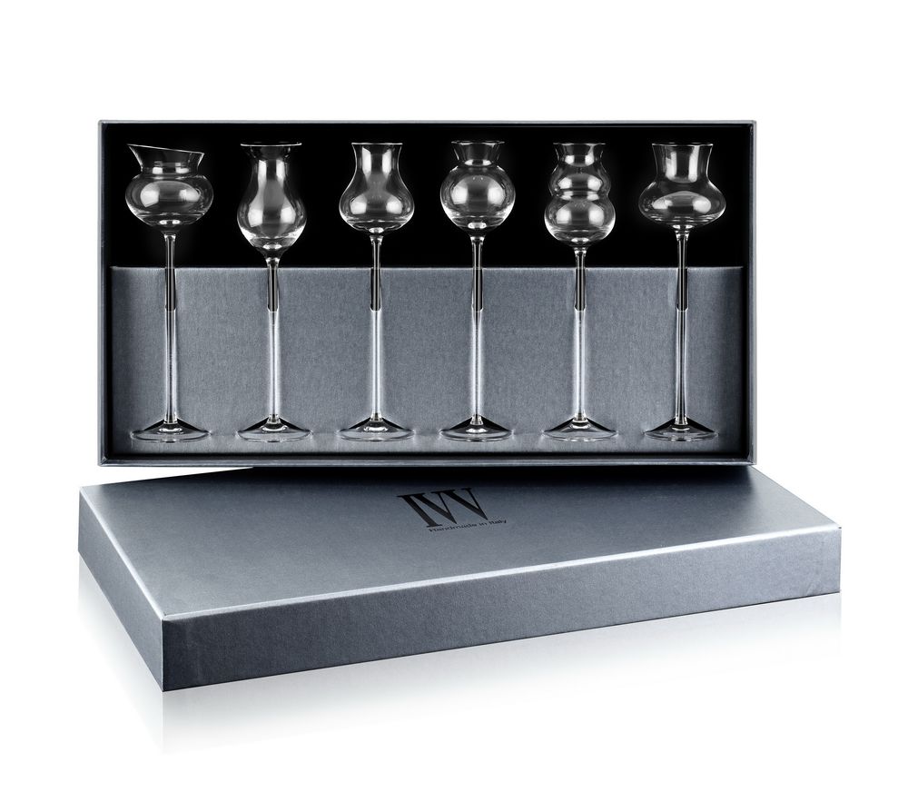 В набор входит 6 бокалов: для рома, для вина, для виски, для граппы, для аквавита, для кальвадоса. Фирменная упаковка.