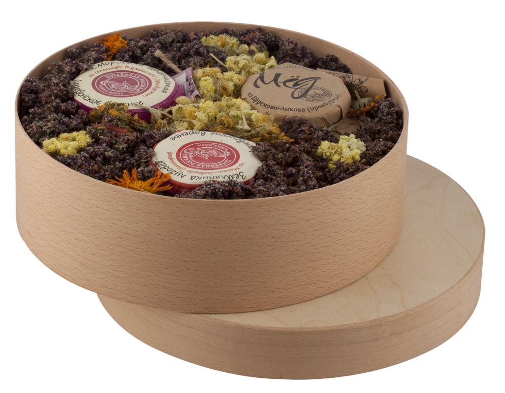 В наборе: варенье из смородины золотистой (200 мл), варенье из земляники луговой (200 мл), 1 банка (200 мл) меда в ассортименте (липа с луговым разнотравьем или гречишный или цветочный), подарочный короб из натурального шпона березы или бука (в ассортименте), наполнитель (луговые и лесные травы и плоды сушеные: душица, чабрец, зверобой, бессмертник, плоды шиповника)