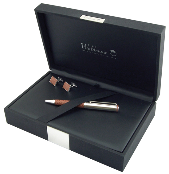 Каталог рекламных сувениров » Пишущие принадлежности » Waldmann LACERTA Набор: ручка шариковая и запонки ,дизайн-линии/кожа "Ящерица" светло-коричневая 8800.00 р + - Артикул P_0098/СL Материал *сереброЦвет коричневый светлыйЦвет основн коричневый