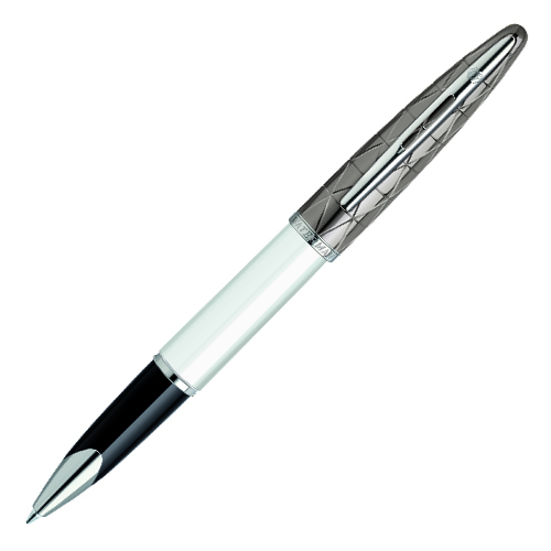 Роллерная ручка Waterman Carene DeLuxe. Корпус - лаковый, насыщенного белого цвета, колпачок - сталь с гравировкой, детали дизайна с палладиевым покрытием, линия письма - тонкая