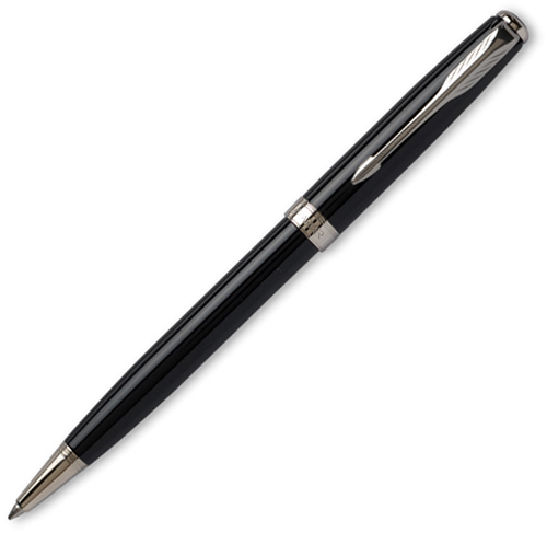 Шариковая ручка Parker Sonnet, цвет - черный/серебро. Корпус и колпачок - латунь, лаковое покрытие, клип - латунь/никель-палладий. Отделка - никель-палладиевая. Поворотный механизм.