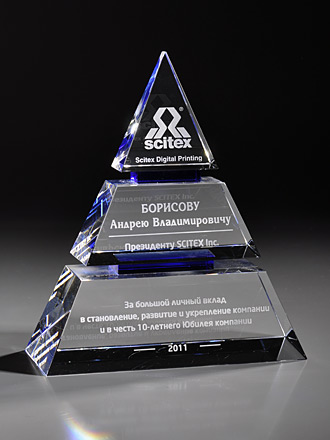 Каталог рекламных сувениров » Офис » Награды BrightAwards » Призы из стекла Приз из стекла 16500.00 р + - Описание Приз из прозрачного и цветного стекла в форме пирамиды. Артикул CA204 Метод персонализации Сандбласт + цветная заливкаРазмер изделия 18х20.5x7.5